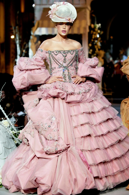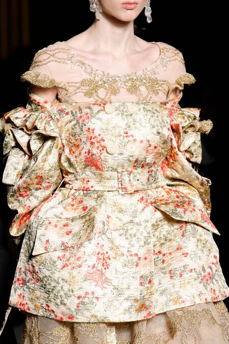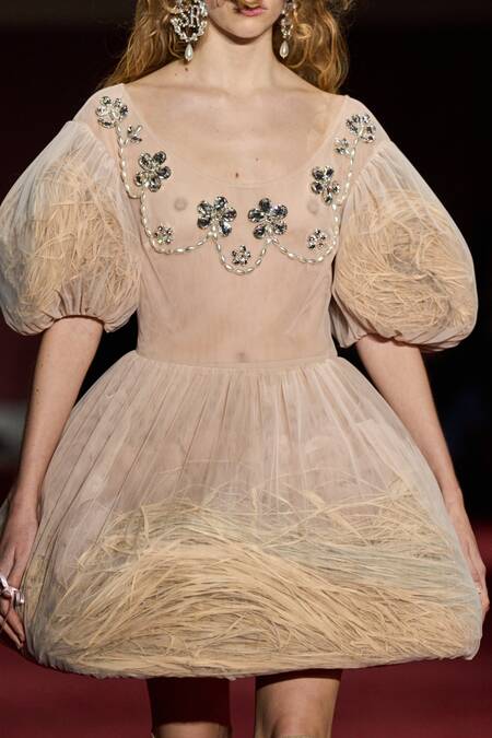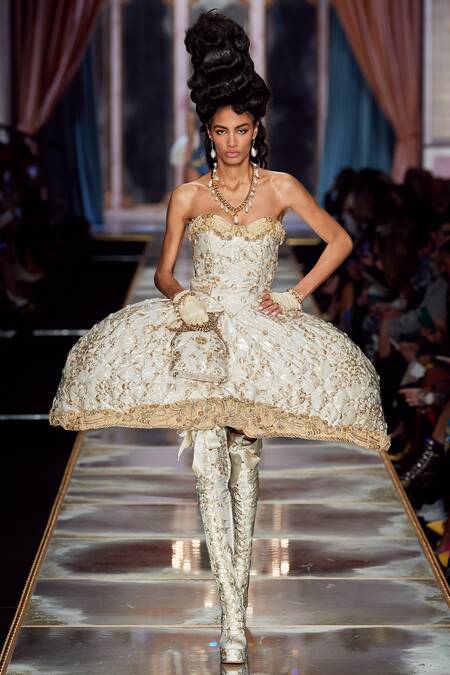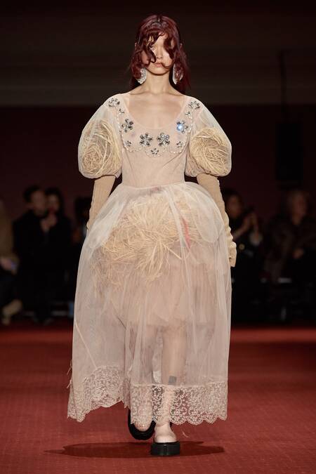 В данном показе был всего один образ, который отсылает к данной эстетике, но какой! В нем присутствует и высокий парик, и платье, напоминающее силуэт robe à la française, и характерный макияж, и, конечно же, множество завораживающих деталей.