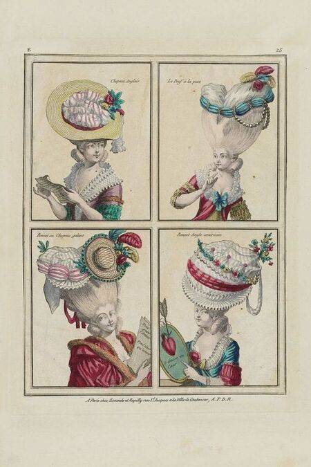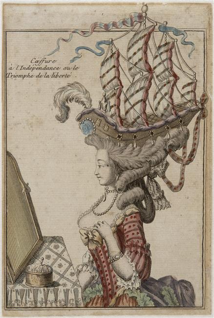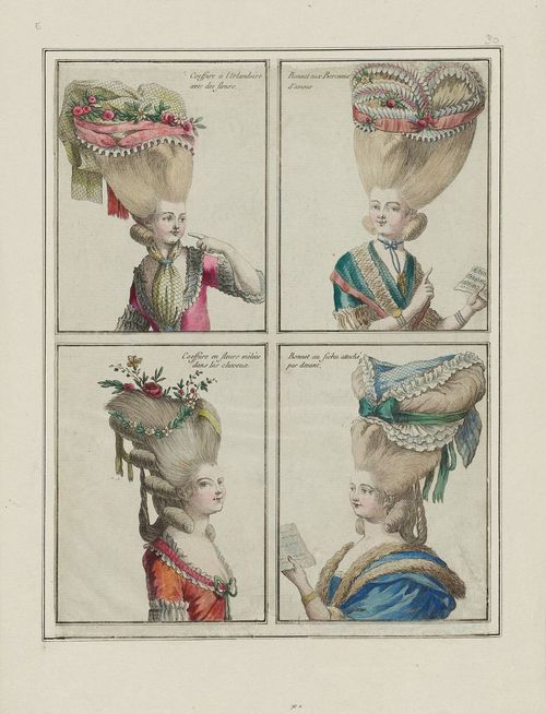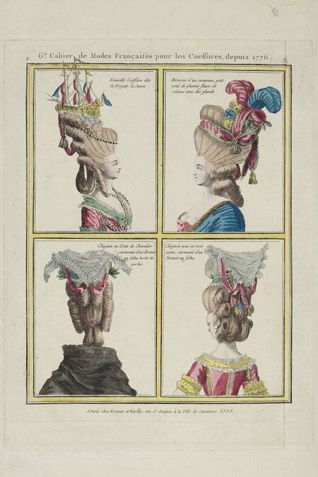 Неотъемлемой частью образа были парики. Они являлись отличной возможностью выделиться и дополнить наряд. Парижский журнал «Courrier de la Mode» в каждом выпуске предлагал новые вариации украшения парика.