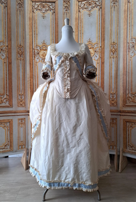Robe à la française считался основным фасоном платья в Европе, оно было в моде среди дворян почти весь XVIII век (преимущественно до 1770-х, но встретить его позже было не редкостью и до 1789 года, Великой Французской революции). Изначально это платье считалось чем-то незаурядным, привлекающим внимание, а при короле Людовике XV стало официальным для французской аристократии. Отличительными чертами платья по-французски являлись две длинные вертикальные складки на спине, спадающие от шеи до пола. Оно являлось распашным, так как под платьем находились каркас панье и корсаж-корсет.