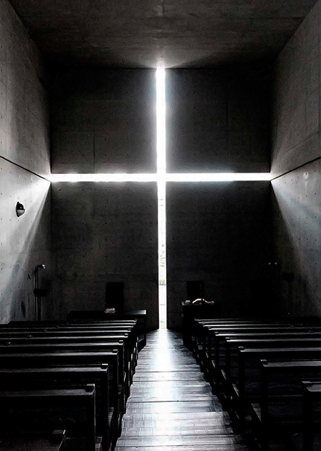 Благодаря свету и теням, выбрасываемым мебелью, полированные и потрескавшиеся деревянные полы становятся похожими на зеркало или водную гладь. Бетонные стены добавляет темноты церкви, создавая сдержанное, медитативное пространство поклонения. Взаимодействие света и тени, поверхности и материала создают двойственность пространства, заключающуюся в сосуществовании невесомого/легкого и сурового/твердого (брутальности бетона и эфемерности солнечных лучей). Соединяясь, различия балансируют пространство размышлений о вечном наедине со своим высшим «Я» и божественным началом.