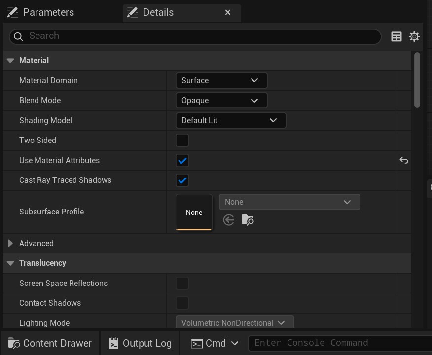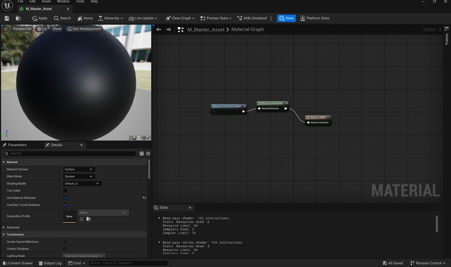 В Unreal Engine 5 мы создаем простой Master Material и в панели Details ставим галочку напротив Use Material Attributes. Таким образом, разблокируется функция Layers в Материале.