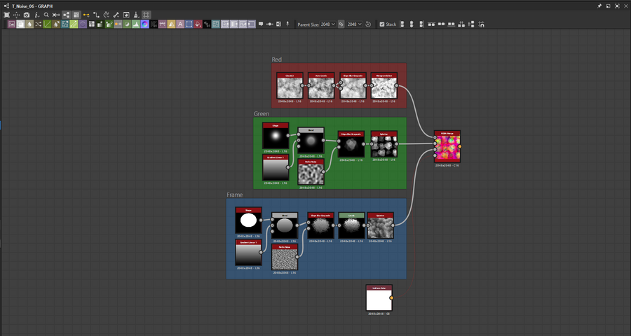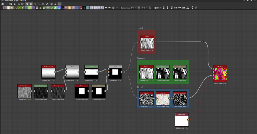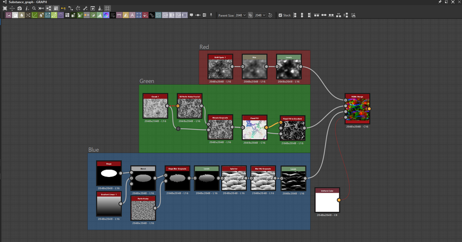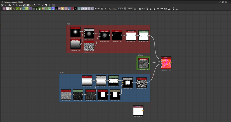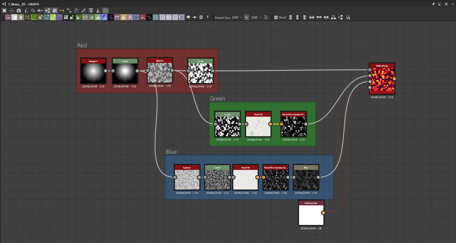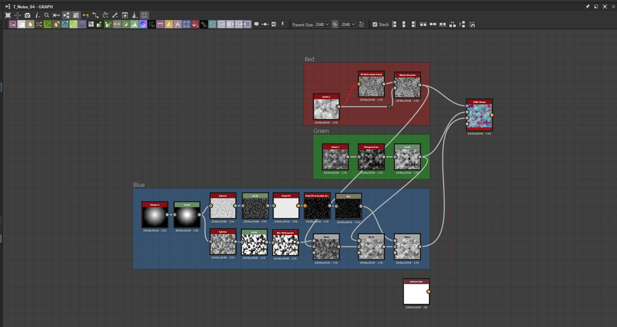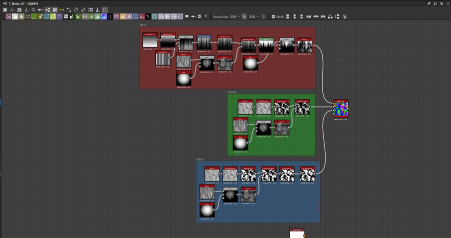 Кроме того, чтобы уменьшить размер карт, я помещаю карты шумов в 3 канала (Red, Green и Blue). Таким образом, вес карт уменьшится и в дальнейшем работать непосредственно в самом движке будет намного удобнее. Это также можно сделать в Substance Designer с помощью ноды RGBA Merge. На графах я выделила ноды каждого канала.