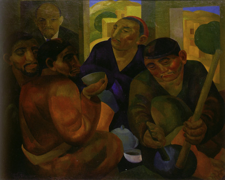 В картине «Чайхана с портретом Ленина» Александр Волков изображает Восток в движении, готовый к труду и переменам. Образ Ленина, размещённый в левом верхнем углу, остаётся в тени, но сохраняет композиционную значимость, соединяясь диагональю с заточенным кетменем — символом земледельческого труда. Центр полотна занимает четверо дехкан, облачённых в оттенки земли, зелени и воды — природную триаду возрождения. Одежда и предметы подчёркивают их связь с землёй, а сцена чаепития намекает на созидательную энергию. Волков мастерски передаёт пафос преобразований, избегая агитации. Через цвет, форму и композицию он выражает идею величия человека, способного превратить пустыню в цветущий сад. Картина соединяет авангардные принципы с восточной философией, создавая многослойный художественный образ.