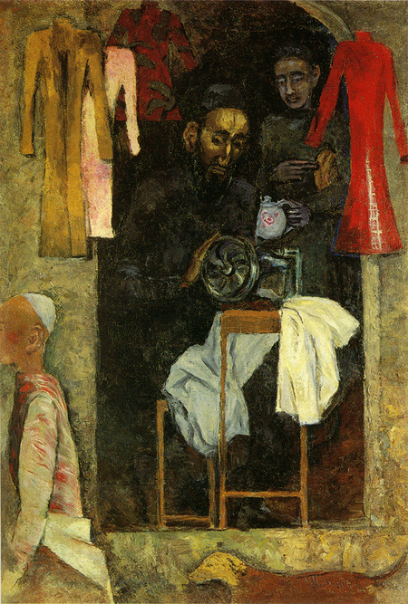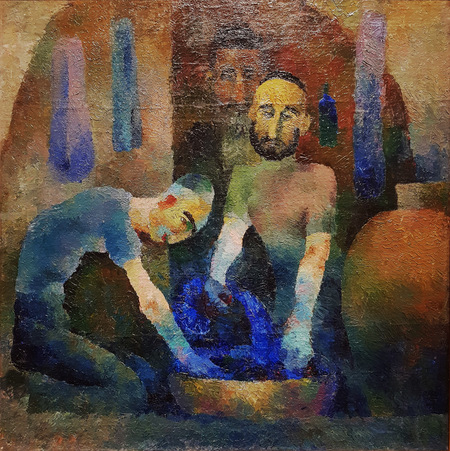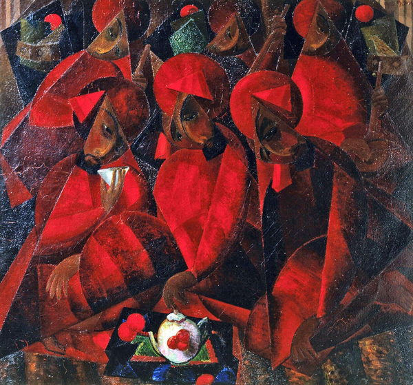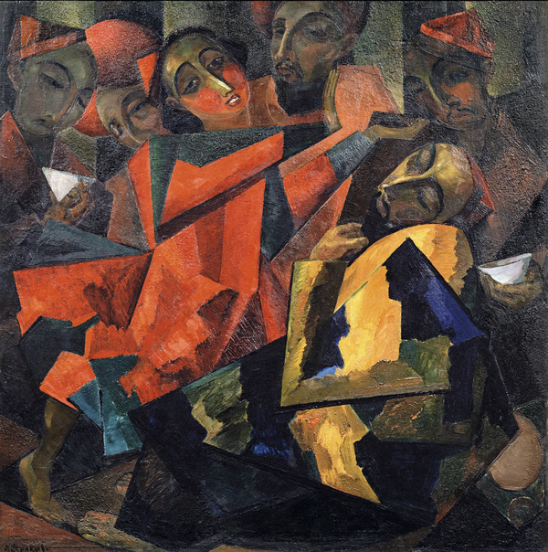 В той же технике выполнена картина «Танец». Построение формы геометрическими планами и совмещение в лицах персонажей фаса и профиля сближает с кубизмом и так называемой «системой треугольников Волкова», создает простую и выразительную композицию.