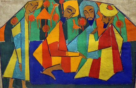 «Взяв за основу принципы народного искусства и создавая композиции из геометрических форм и яркого, локального цвета, он стремился к достижению плоскостности. Именно плоскостность, двухмерность восточного искусства становилась со времен А. Матисса одним из важнейших условий для реализации пластических идей авангарда.»3