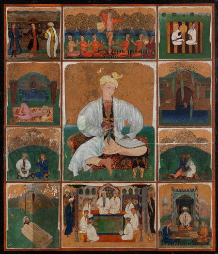 Используя язык восточной миниатюры и совмещая его с канонами изобразительного искусства кватроченто, он создает композицию с одним центральным изображением и повторяющей схему икон с «клеймами». Это история любви и приключений юноши-бачи в 10 картинках, которые сгруппированы вокруг центрального образа