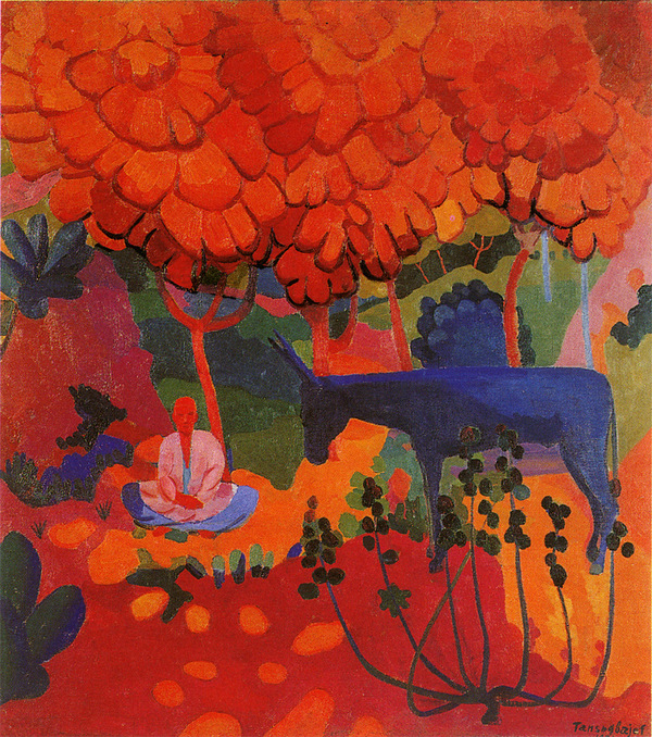Раннее творчество Тансыкбаева часто сравнивали с Гогеном — его интерес к народным мотивам сочетался с поиском новых пластических решений. Однако, помимо декоративности, в его работах присутствует философский подтекст, стремление передать знаковость образов. Работа «Портрет узбека на желтом фоне» (1934) — яркий пример: национальный типаж превращается в символ, упрощенные деревья и орнаментальная кайма формируют ощущение традиционного узора, а открытые цвета создают эффект «живого знака». В 1930-е годы Тансыкбаева активно работал в неопримитивистском ключе («Самарканд. Узбек»), где элементы народного искусства перерабатывались в авангардные формы. Он воспринимал себя как художник Нового времени, совмещая наследие Востока с западной концепцией индивидуального художественного выражения.