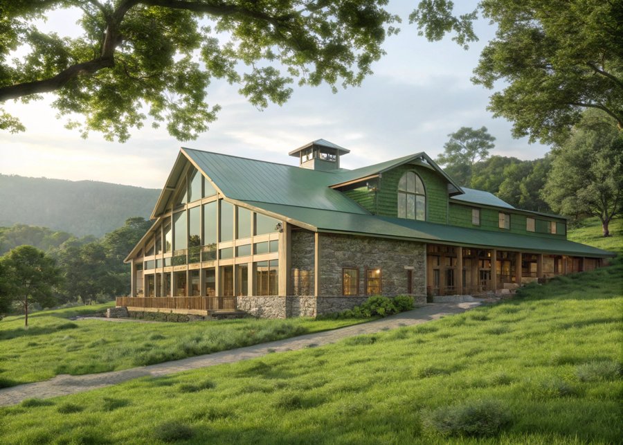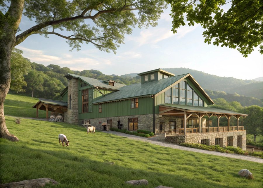 Prompt: а picturesque scene of a large, green eco-farm building, designed with sustainable architecture, surrounded by lush greenery. The building is spacious and modern, with natural materials like wood and stone, blending harmoniously with the surrounding environment. The structure is painted in a soft green hue to reflect the farm’s eco-friendly ethos. Nearby, goats are peacefully grazing on the vibrant green pasture, adding life to the scene. The setting is bathed in natural sunlight, with trees and rolling hills in the background, evoking a sense of tranquility and harmony with nature.