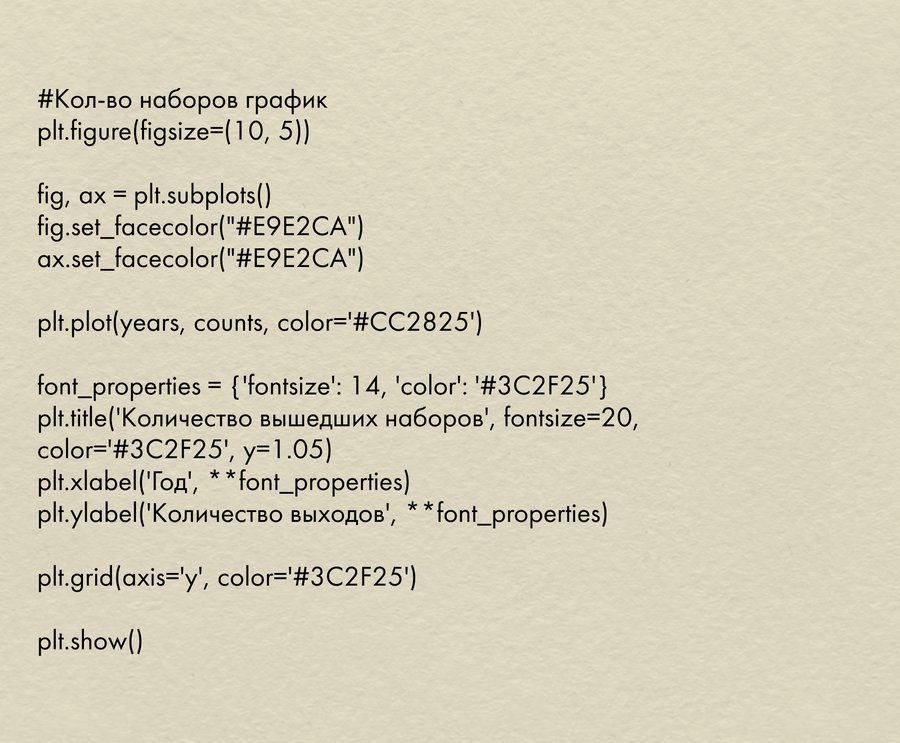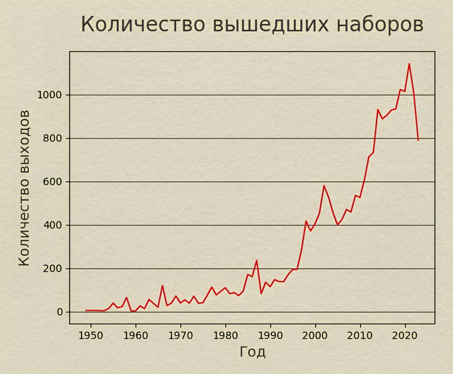 Для анализа количества наборов на протяжении времени, я создаю словарь, для которого использую цикл: если год есть в словаре, то прибавить 1 набор, если нет, то добавить год и 1 набор. Затем сортирую список по возрастанию года.