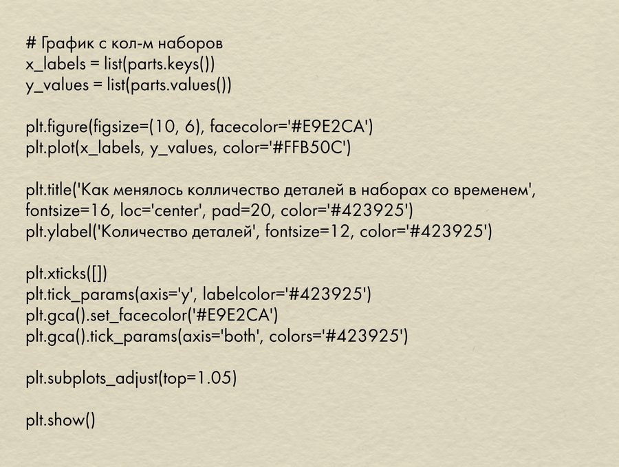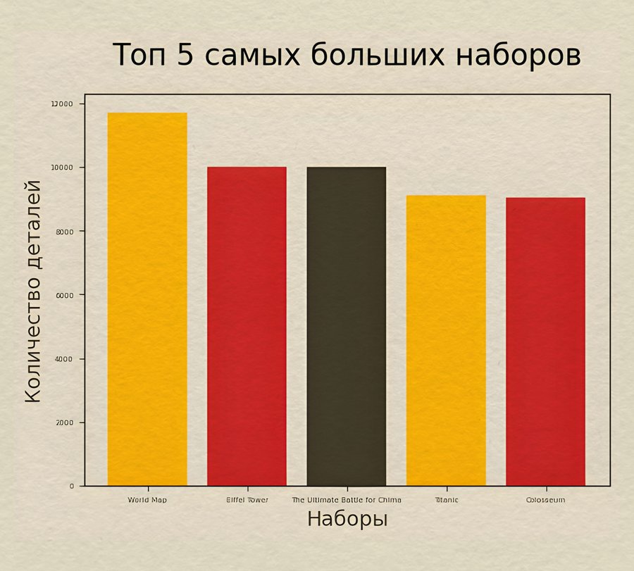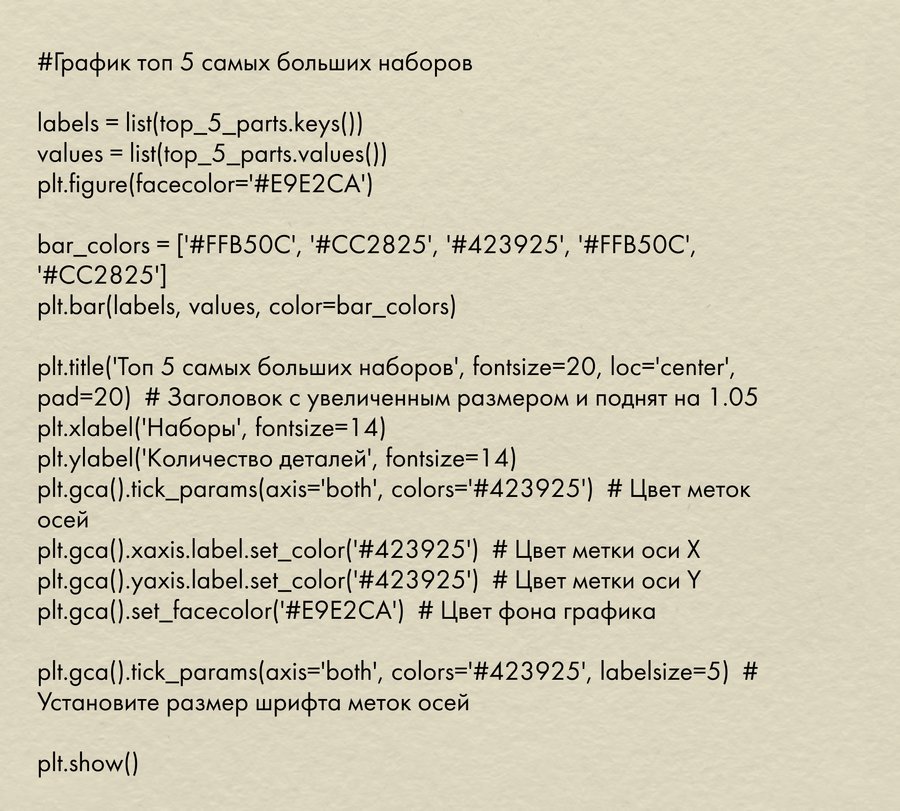Для анализа количества деталей в наборах я сначала убрала строки с значениями NaN, затем отсортировала наборы по году выпуска, создала словарь с названием набора и годом выпуска, и словарь с названием и количеством деталей, отсортировала первый по году выпуска, второй по количеству деталей. Для анализа топ 5 самых популярных тем выделила из второго словаря первые 5 элементов.