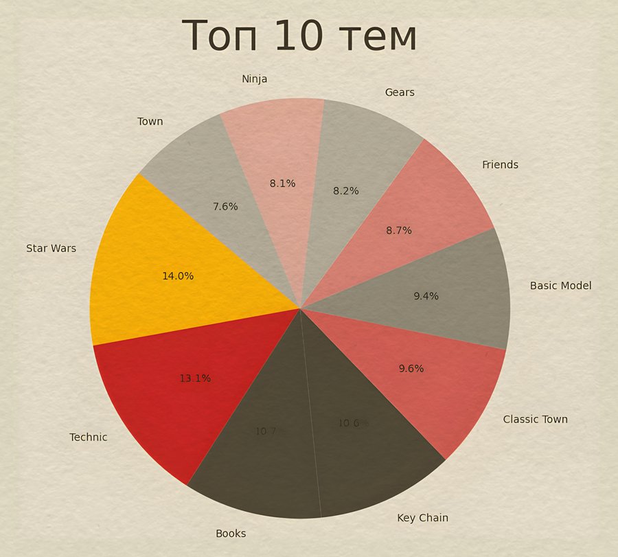 Данный график демонстрирует, что для самых популярных тем было выпущено приблизительно одинаковое количество наборов. Однако лидирует тема Звездных войн.