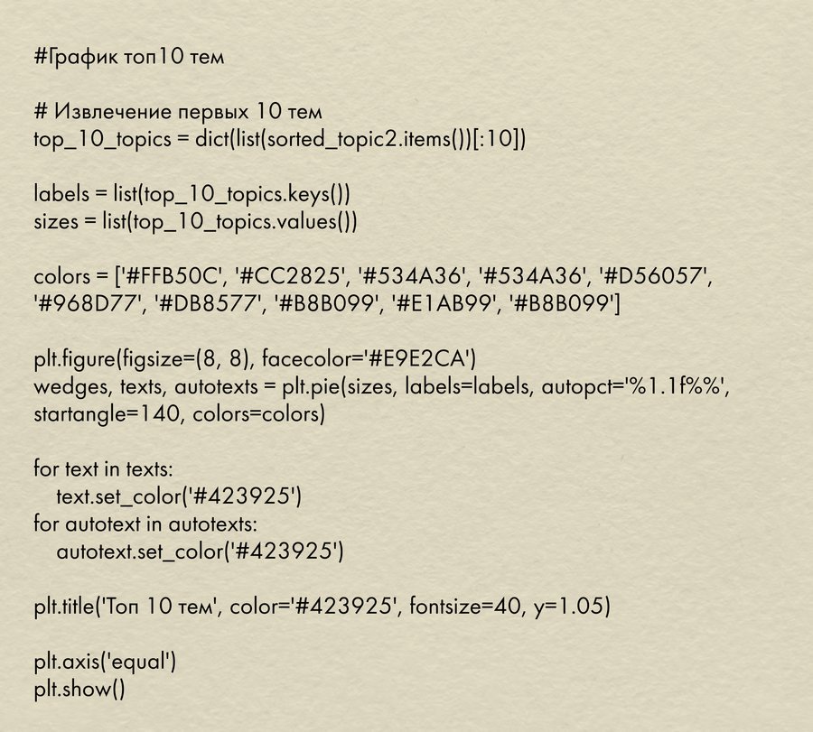 Для анализа самых популярных тем я создала словарь, который аналогично заполняю темами и количеством наборов, затем создаю второй словарь, в который объединяю темы с одинаковыми первыми 4 буквами (так как у многих тем было по несколько серий) и сортирую словарь по убыванию количества наборов.