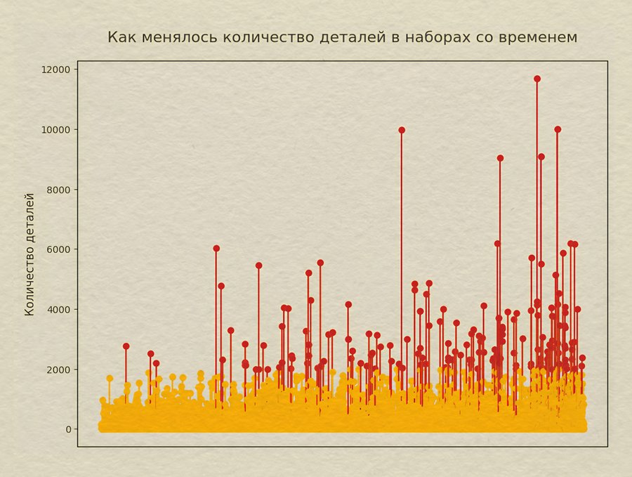Данный график показывает, что, по общей тенденции, с каждым годом наборов LEGO становится все больше и больше. Однако иногда может выпускаться меньше наборов, чем в прошлом году.