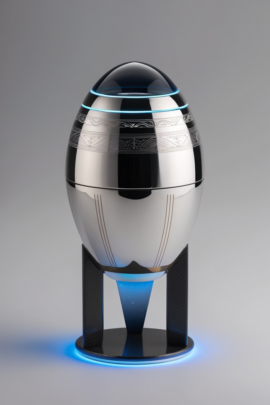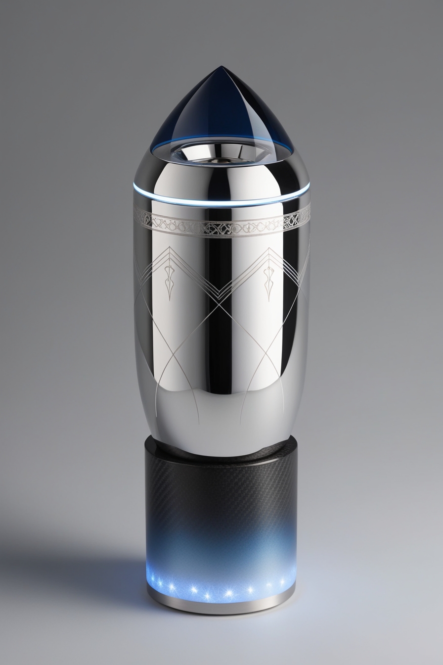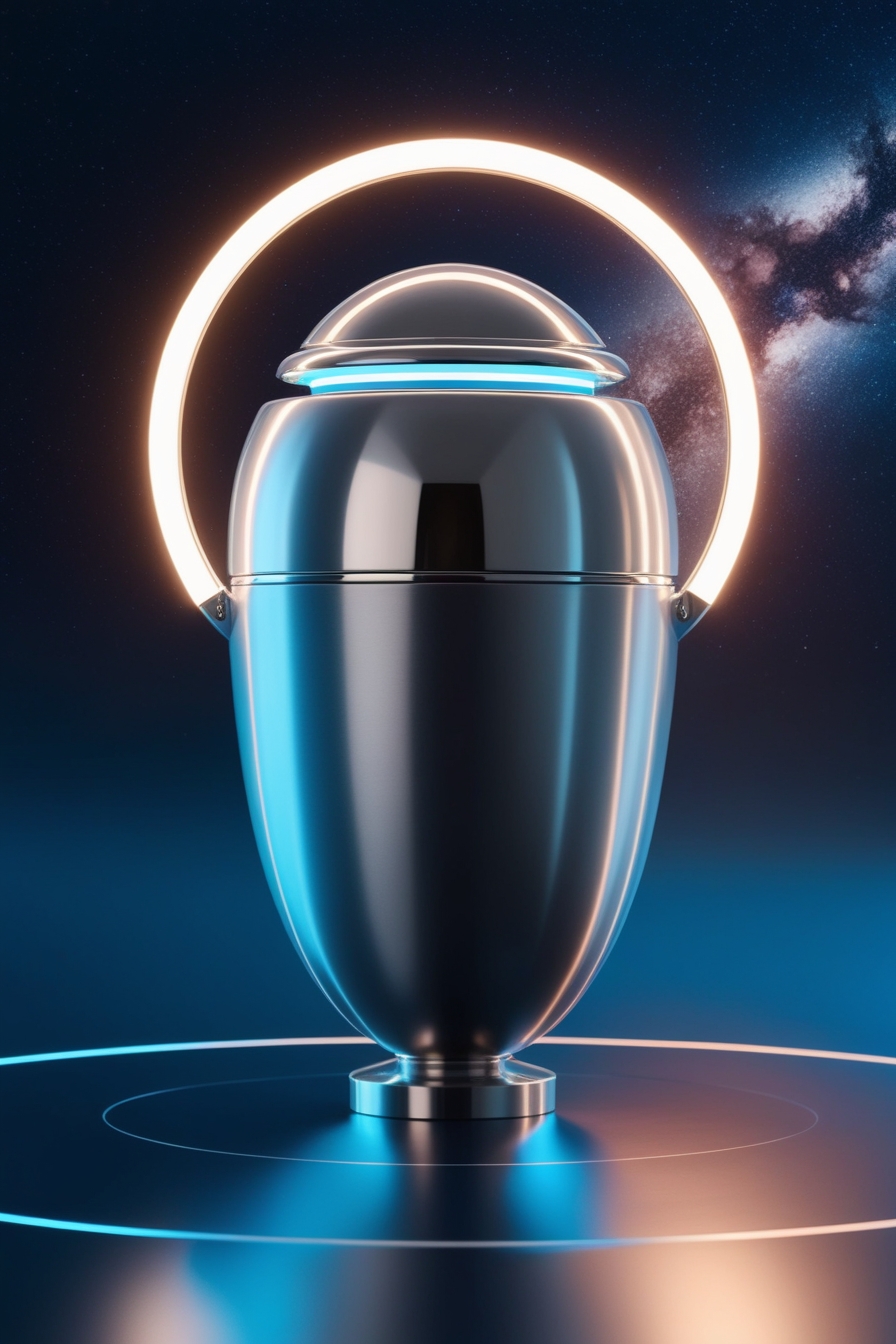 «A sleek, futuristic capsule for storing ashes, designed to be launched into space, featuring a harmonious blend of technological and elegant minimalistic details, with a polished, silver-metallic exterior that subtly reflects light, adorned with intricate, laser-engraved patterns and fine, silver lines that evoke a sense of sophistication and reverence, a delicate, crystal-like window at the top, allowing a glimpse into the sacred contents, surrounded by a thin, LED-lit rim that pulsing with a soft, celestial blue glow, mounted on a slender, carbon-fiber pedestal, with a subtle, gradient-effect base that fades from a deep, midnight blue to a light, starry night sky, evoking the infinite vastness of space, and a small, golden plaque with a simple, yet elegant, sans-serif font, bearing the name of the deceased, or a meaningful quote, adding a touch of humanity to this extraordinary, otherworldly vessel»