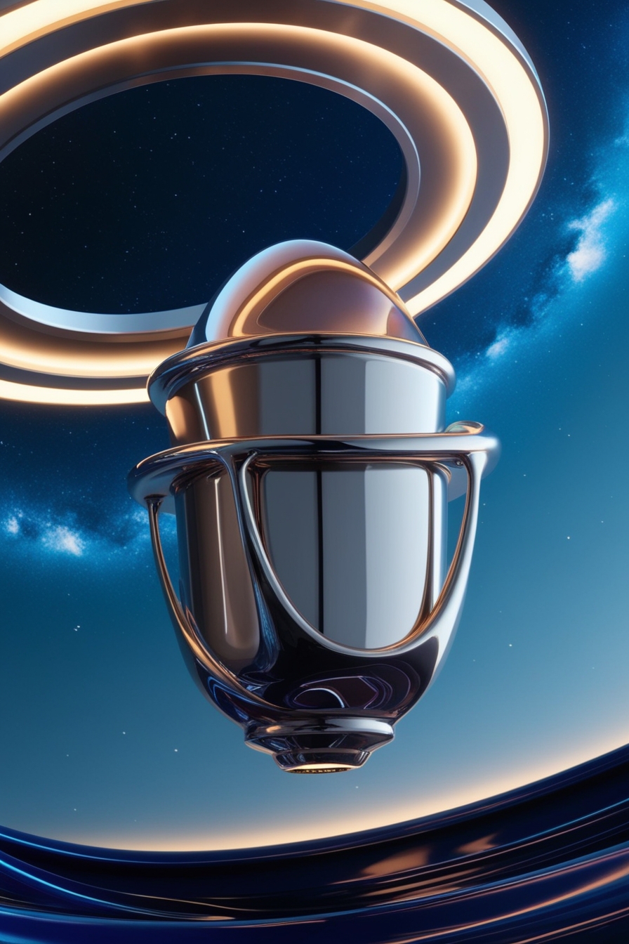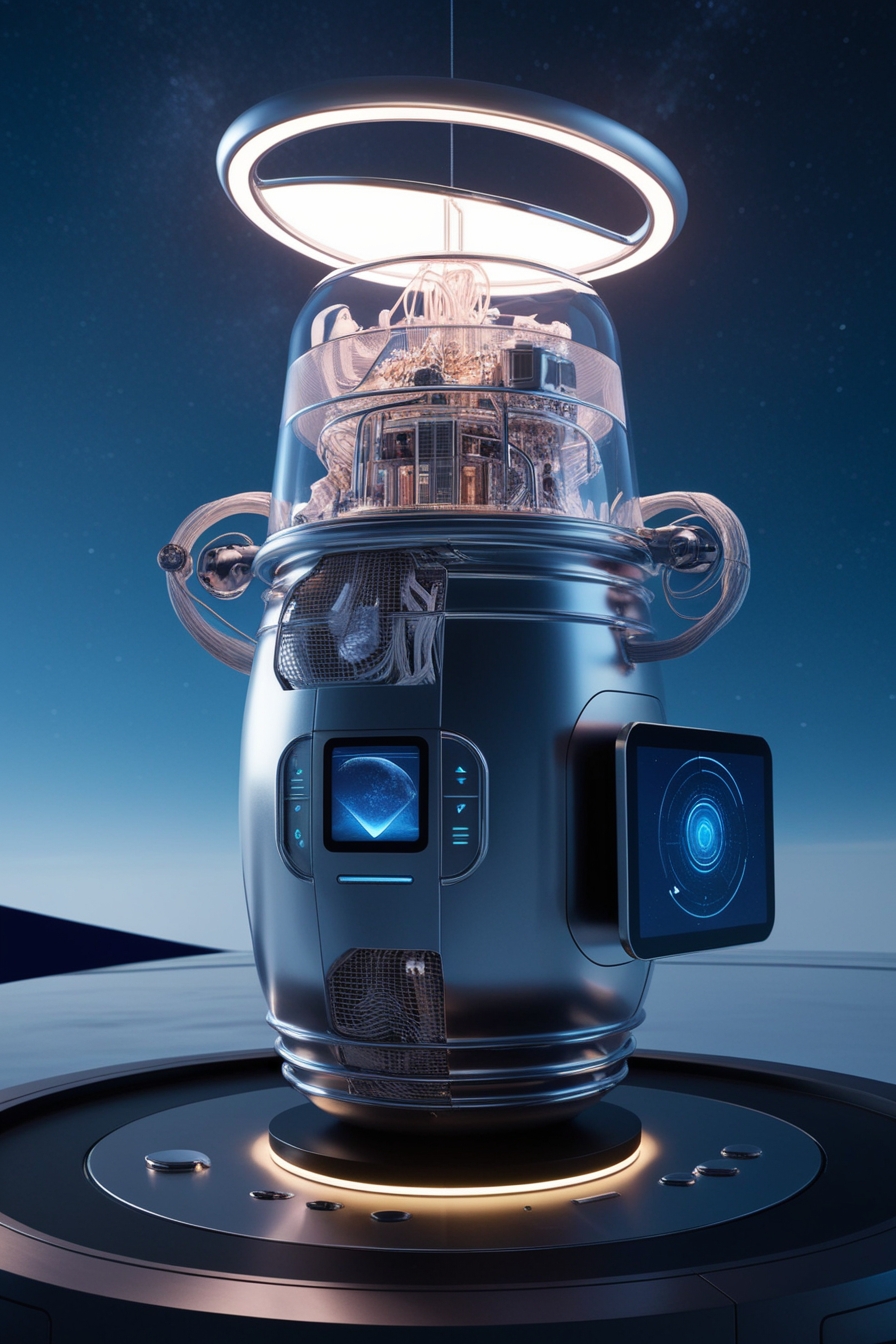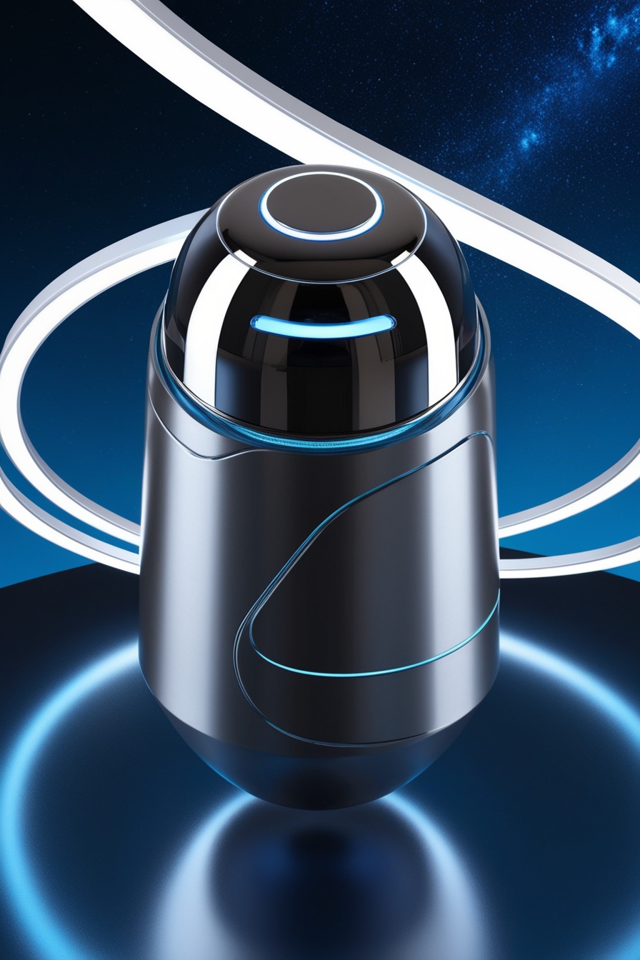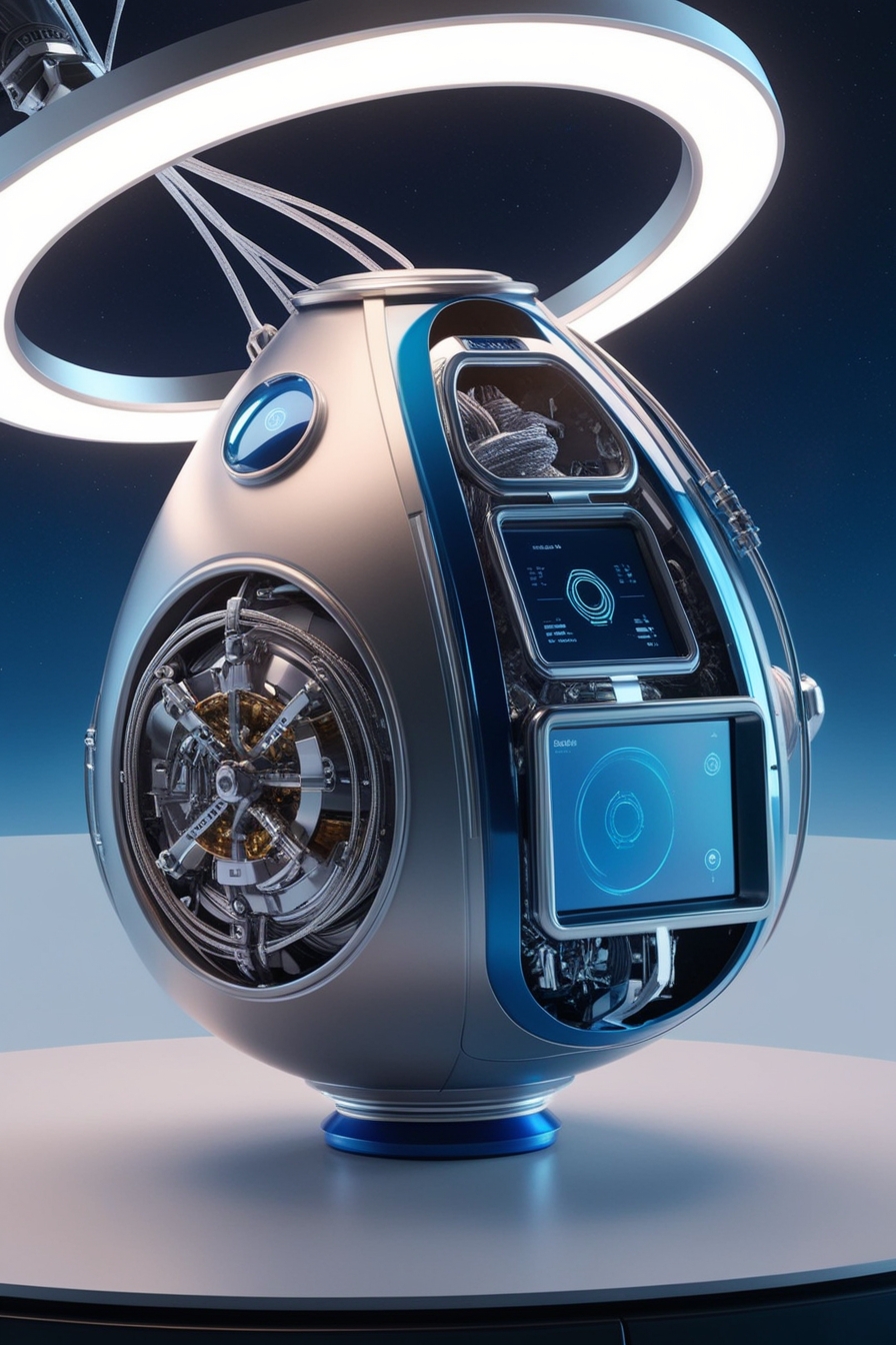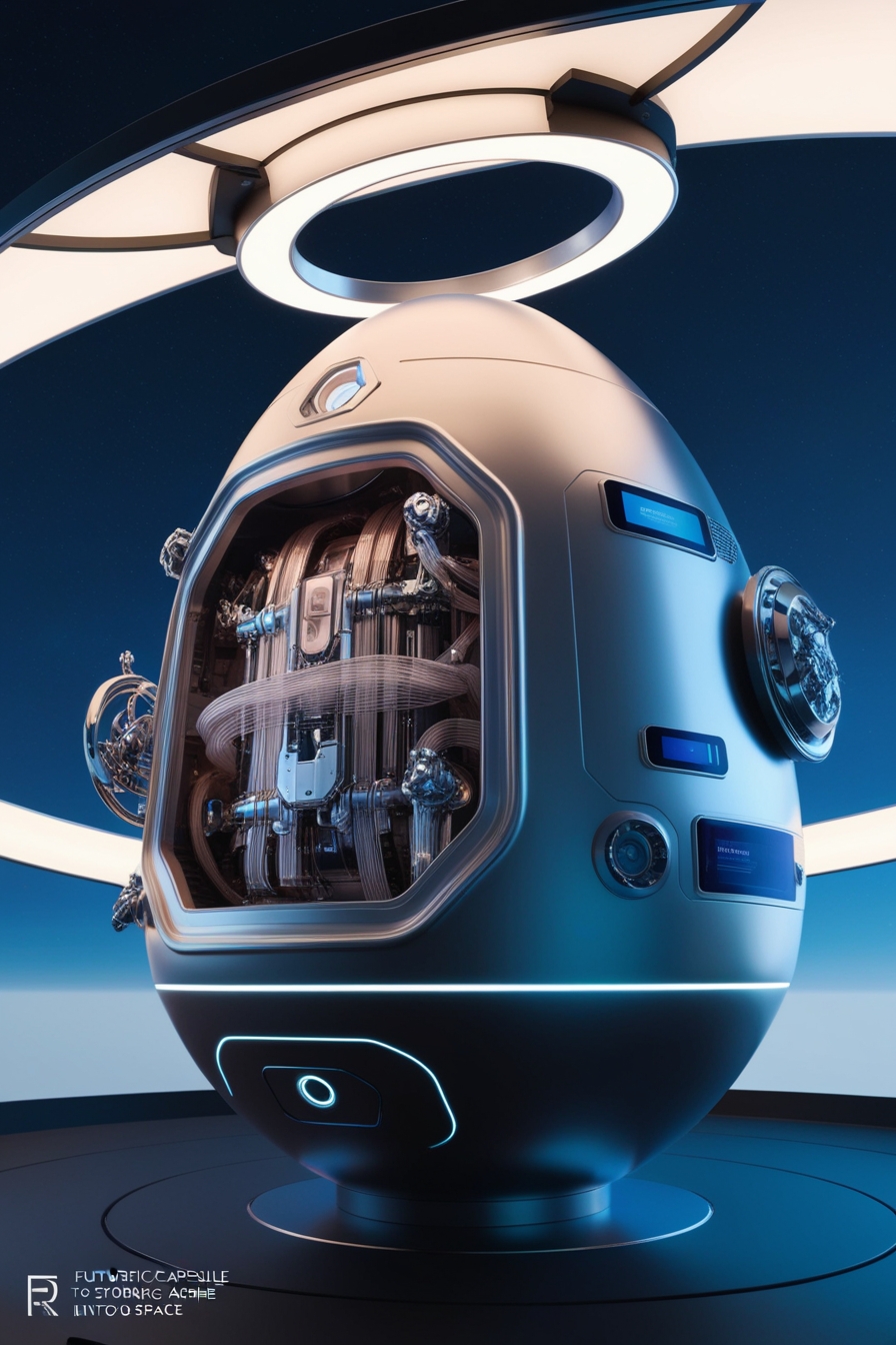 «A highly detailed, photorealistic 3D render of a futuristic Capsule designed for storing ashes to be sent into space, showcasing a perfect blend of technological sophistication and elegant minimalism, with intricate mechanical components, delicate cable mesh, futuristic screens, and sleek buttons, illuminated by a vibrant ring light that highlights the capsule’s smooth, metallic surface, set against a stark, starry night sky, with an exaggerated, cinematic quality, reminiscent of a Pixar animation, created using advanced rendering engines such as Unreal Engine, Octane Engine, or V-Ray, featuring a bold, vibrant color palette with shades of cobalt blue, metallic silver, and deep indigo, with a sense of excitement and wonder.»