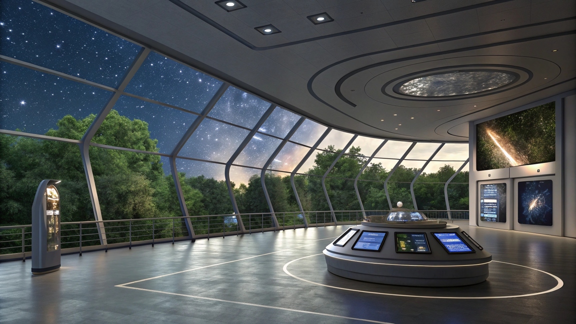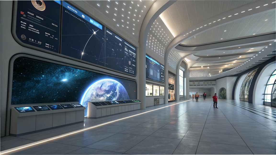 «Create an image of interactive screens and panels within the main hall of the futuristic space agency. These screens should be sleek and integrated into the architecture, utilizing a high-tech aesthetic with minimal bezels and a seamless blend with the walls. The screens should display real-time information about upcoming space launches, astronomical events, and other relevant cosmic phenomena.