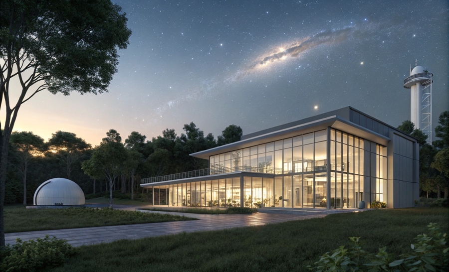 «Create an image of the main hall within a futuristic space agency building designed for sending ashes into space. The hall should be minimalist and high-tech, with large windows offering a panoramic view of the surrounding greenery and night sky. The space features smooth, reflective surfaces in deep blues, silvers, and metallic accents, with subtle lighting simulating distant stars. In the center, a display area showcases the mini capsule used for sending ashes, surrounded by interactive digital screens displaying cosmic models and upcoming launches. The furniture should be minimal, comfortable, and dark, enhancing the serene, contemplative atmosphere.»