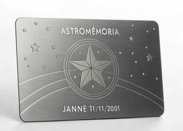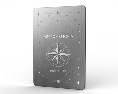 Design a minimalist memorial metal card in the shape of a star for the space memorial agency 'Astromemoria'. The card is made of polished silver or dark gray metal with a smooth matte finish. The surface features an engraved star symbol at the center, surrounded by delicate cosmic patterns, such as faint orbital lines or subtle constellations, etched with precision.