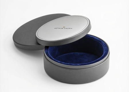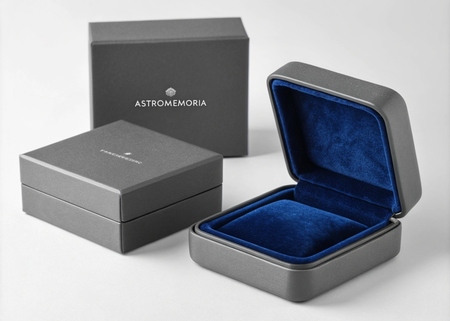 Design a minimalist, elegant packaging for a space memorial capsule. The outer box is dark gray (#2C2C2C) with a matte finish, featuring a sleek silver logo of 'Astromemoria' embossed on the lid. The design is clean and sophisticated, with smooth edges and no additional text on the exterior.