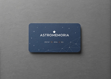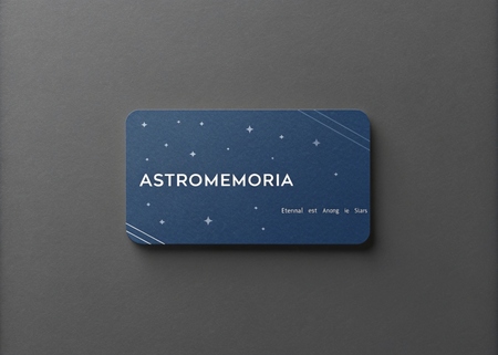 Design a minimalist business card for a space memorial agency named 'Astromemoria'. The front side features a deep blue background (#001F3F) with a sleek silver logo at the center or top-left corner. The text includes the name 'Astromemoria' in a modern sans-serif font (such as Montserrat or Avenir Next) in white or silver, along with contact details in smaller, evenly spaced text. One corner of the card is slightly rounded or laser-cut for a futuristic feel.