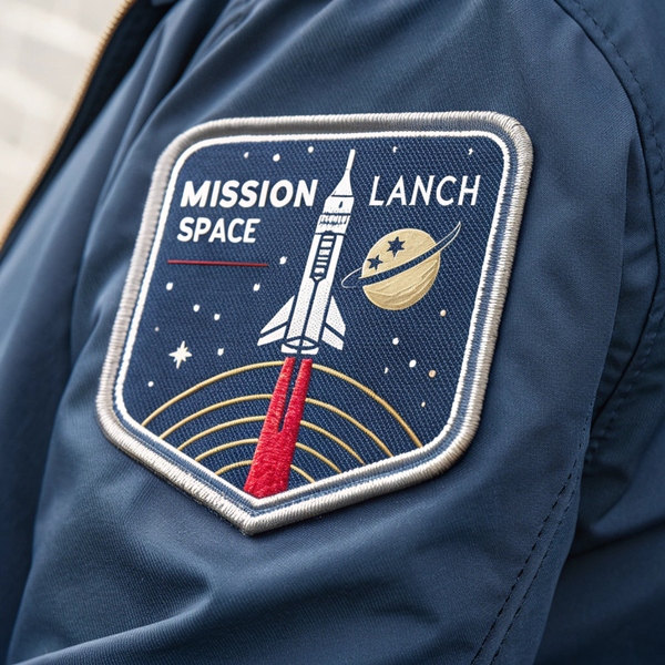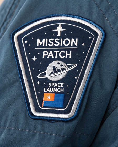 «A stylish mission patch, featuring a cosmic theme. The patch includes a central icon of a vessel carrying ashes, surrounded by orbital lines and a starry background. It incorporates space for a name and launch details in a clean sans-serif font. The colors are deep blue, silver, and accents of white and black, conveying professionalism and reverence. The patch is displayed on a piece of clothing, such as a jacket sleeve or chest area, blending seamlessly with the fabric texture. The design symbolizes a memorial spaceflight and the infinite wonder of the cosmos.»