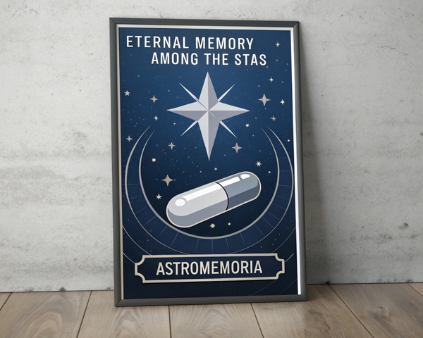 «Create a captivating poster for the space memorial agency 'Astromemoria' that embodies the brand’s existing visual identity. The design should feature a deep blue background (#001F3F) with silver and dark gray accents, creating a cosmic atmosphere. The central focus of the poster should be a sleek, minimalist image—such as a stylized capsule, a glowing star, or an abstract cosmic symbol—symbolizing the eternal journey of the departed. The 'Astromemoria' logo should be prominently displayed at the bottom, in silver, with a clean and modern sans-serif font (like 'Montserrat' or 'Avenir Next'). The headline should be powerful and short, conveying a key message such as 'Eternal Memory Among the Stars' or 'A Journey to the Stars'.
