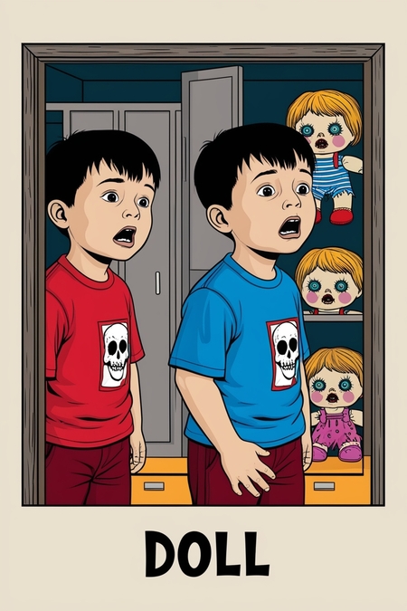 promt two twin boys, one with a red T-shirt and a square with black hair, the second with a blue T-shirt and short hair, they are standing at a closet with creepy dolls, they are scared at the bottom it says doll
