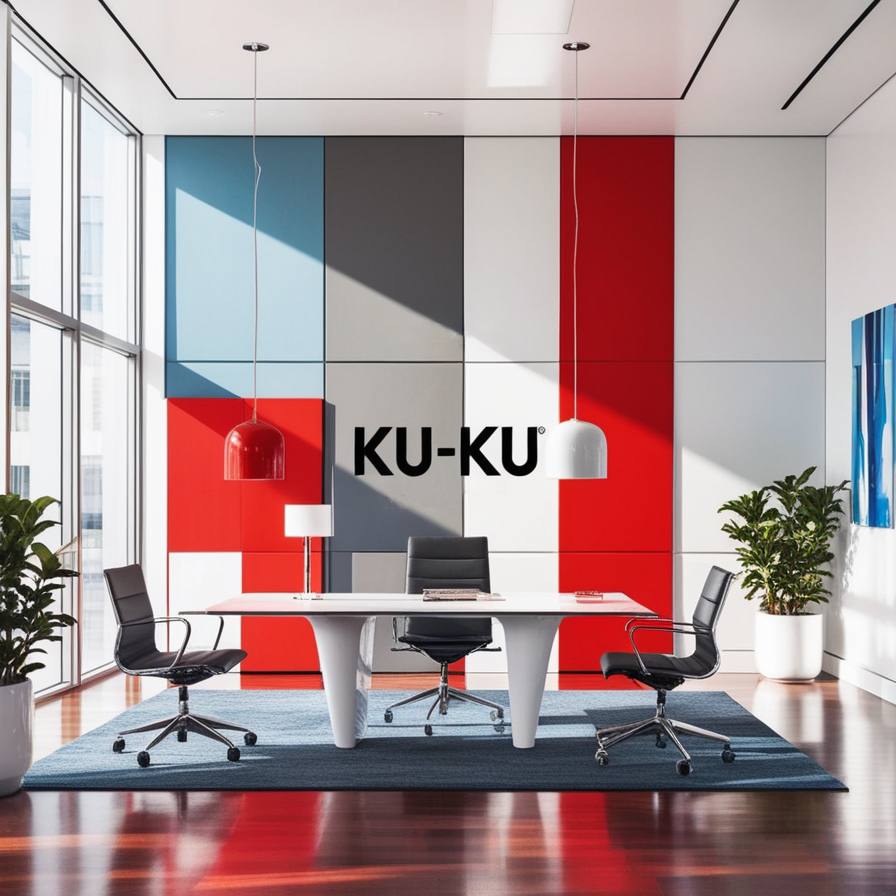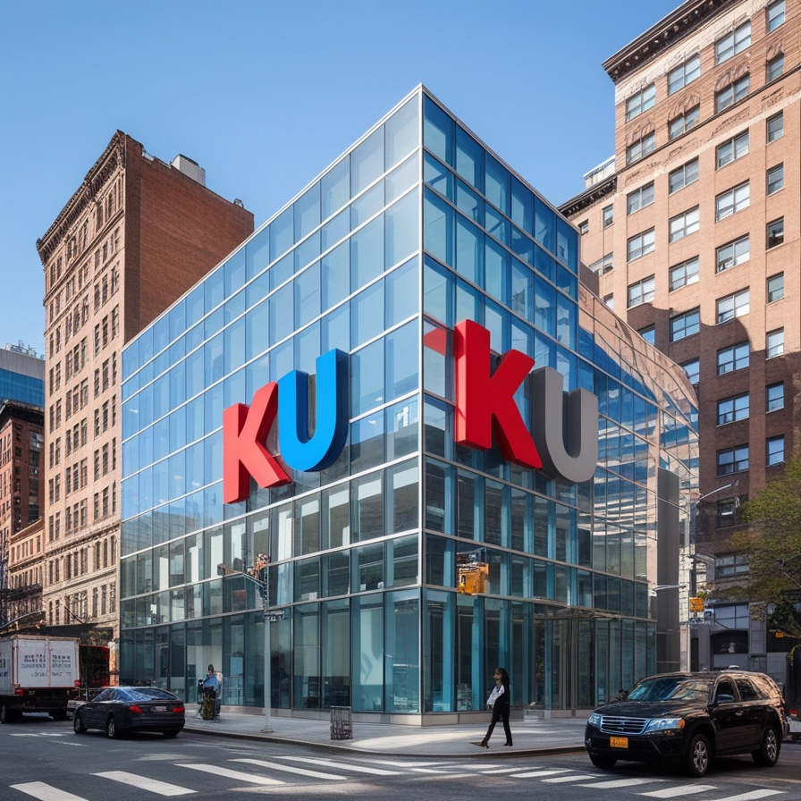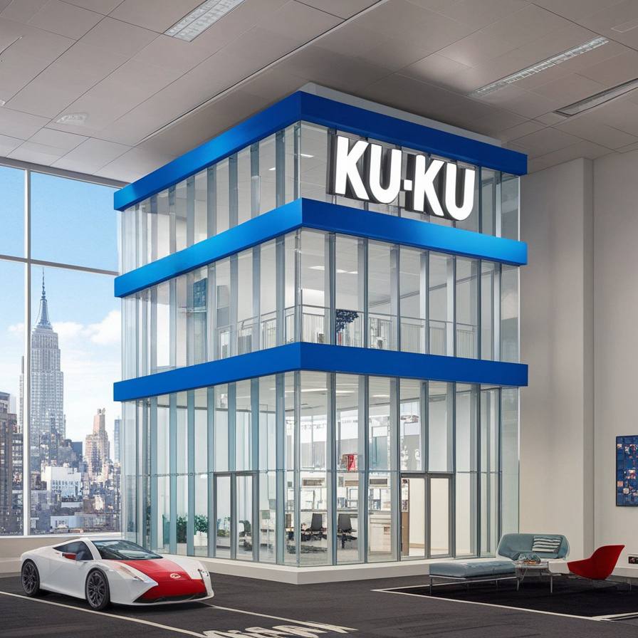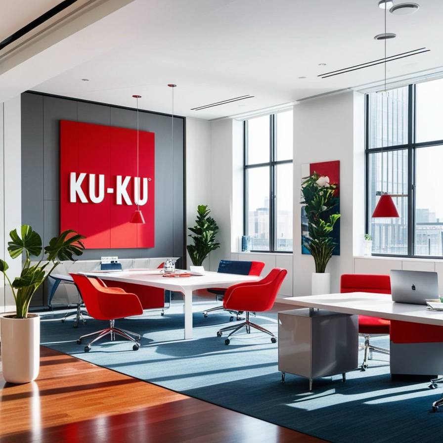 promt: make the office look for the ku-ku brand. The building itself is located in New York, glass. The brand is called Ku-ku, some brand colors are blue, grey and red, but the build it looks like a typical American building.