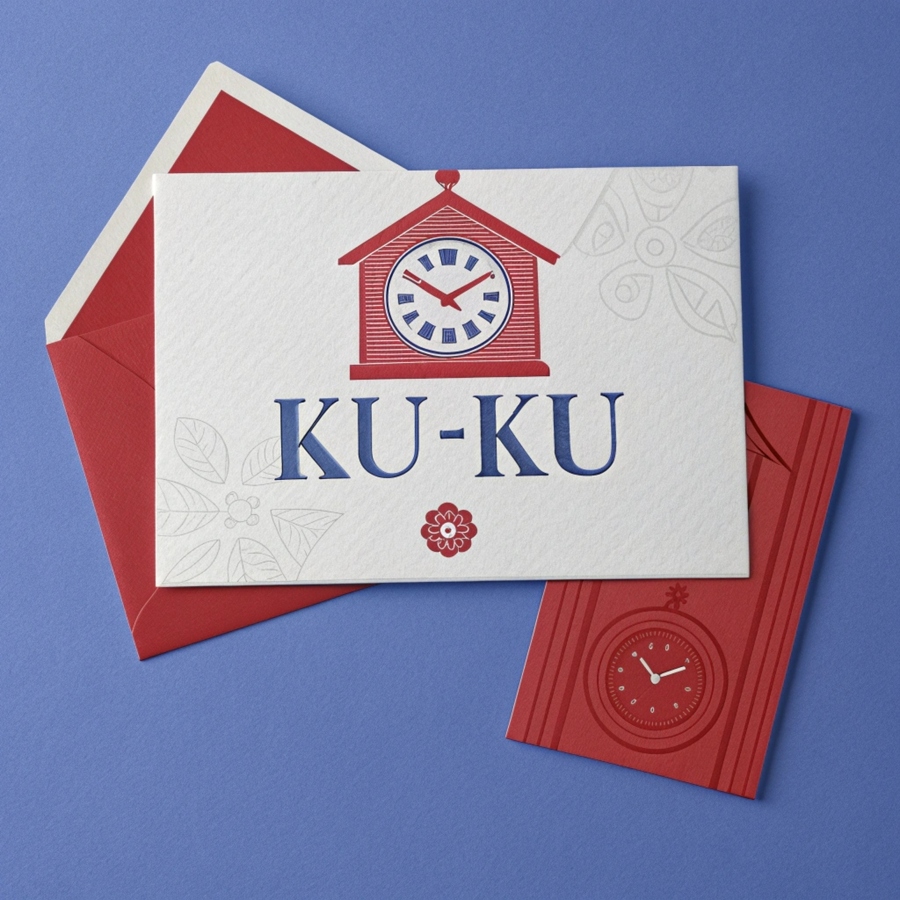 Generate letterheads and business cards for the brand of modern cuckoo clocks. They should be simple and minimalistic. The brand is called: Ku-Ku. Use only the font: Eastman Roman Alternate Bold.