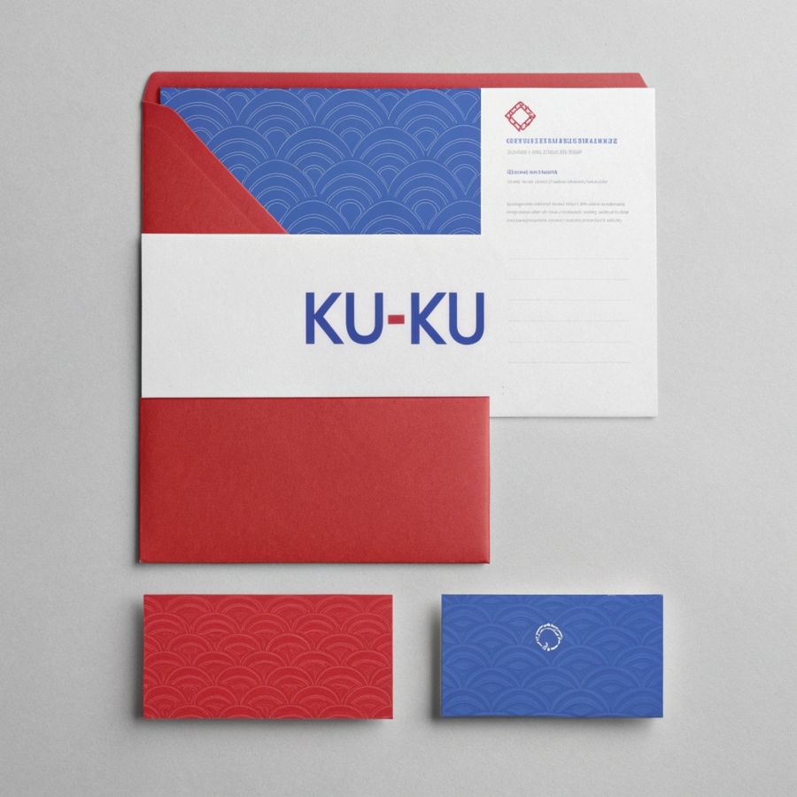 Create a logo only from the font for the brand «KU-KU». The logo should be minimalistic, include blue, red, gray and white colors.