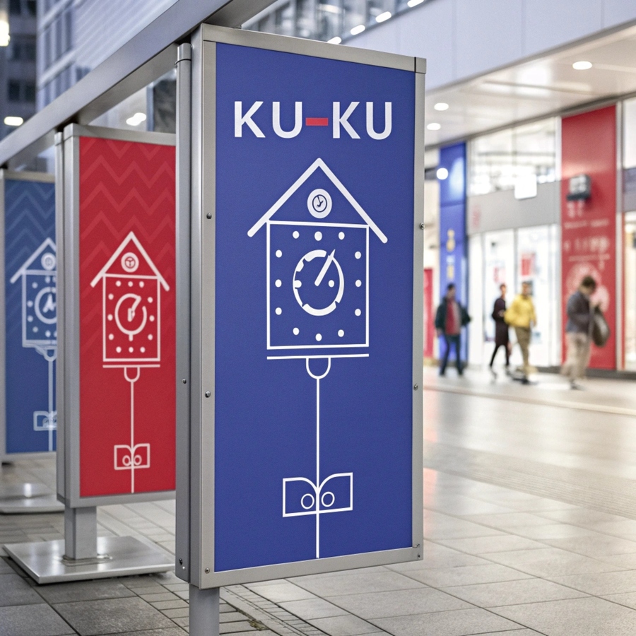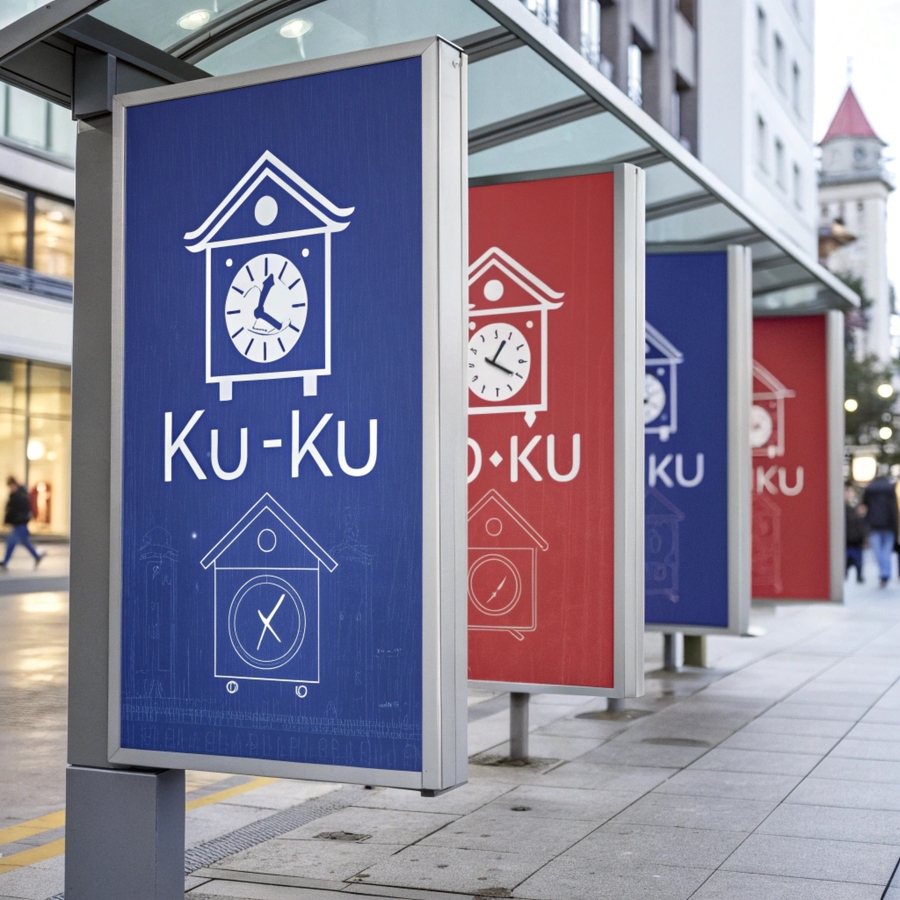 Generate a series of minimalistic posters for the brand of modern cuckoo clocks «KU-KU». The design uses clear, minimalistic text blocks with vector images of the clock. Posters should be well lit, as if they were hanging in a public place with heavy traffic.The posters are located in the city on the street.