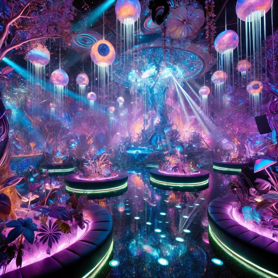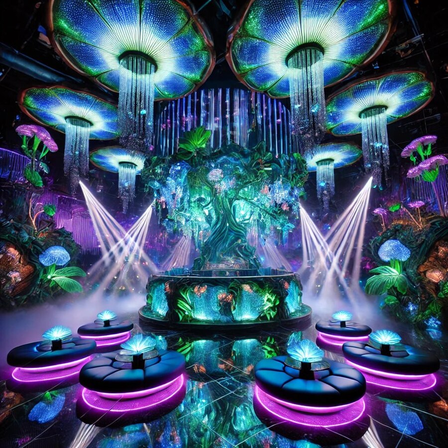 Промт 1: A vibrant and immersive nightclub inspired by the mystical vibes of a glowing alien jungle. The interior features luminous plants, hanging vines