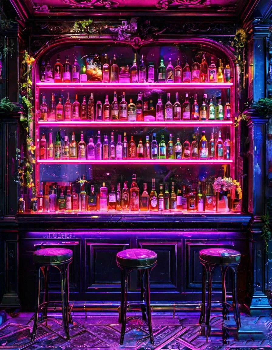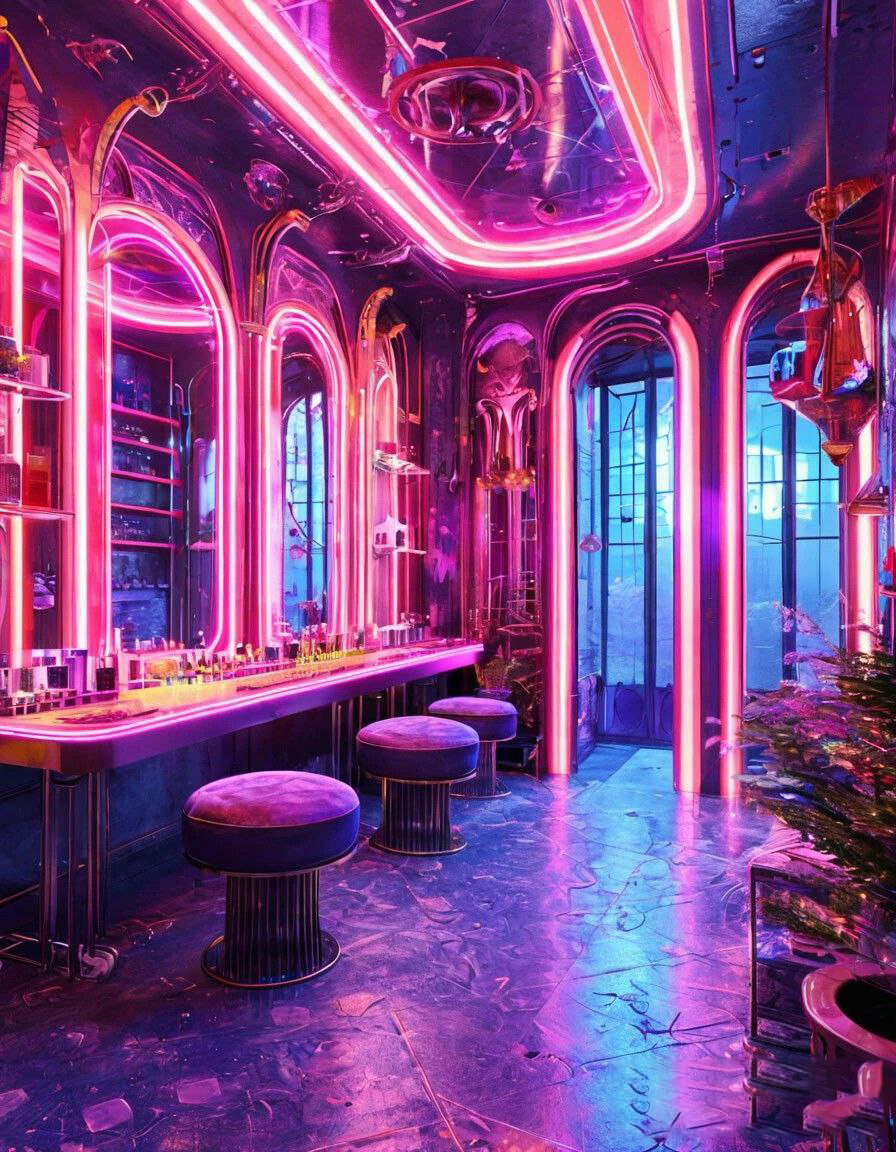 Промт 3: бар для феи напитков в стиле Контрастный, мистический, футуристический, философский, графичный, неоновый, загадочный, астрологический, символичный, минималистичный v.2.0