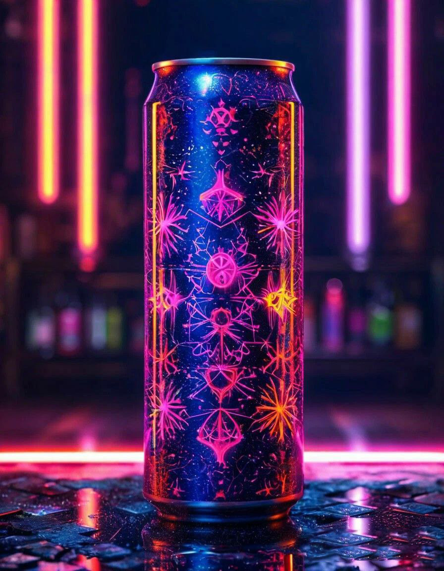 Промт 2: энергетик в стиле Контрастный, мистический, футуристический, философский, графичный, неоновый, загадочный, астрологический, символичный, минималистичный v.2.0