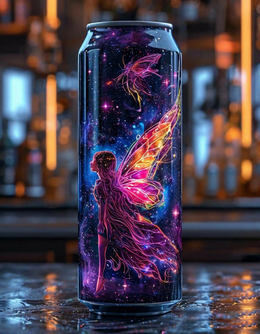 Промт 1: энергетик с изображением феи Контрастный, мистический, футуристический, философский, графичный, неоновый, загадочный, астрологический, символичный, минималистичный v.2.0