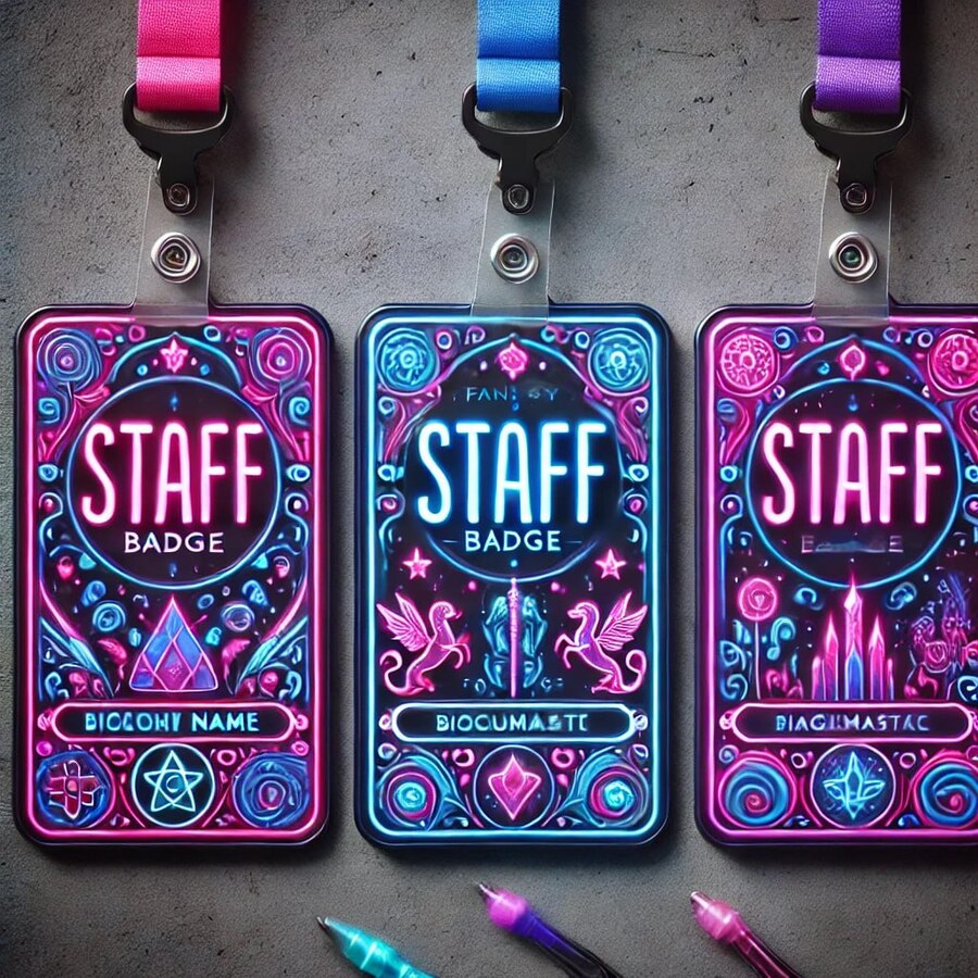 Промт4: Fantasy neon-style staff badges for a magical themed venue, designed as physical items. Each badge is rectangular with rounded edges and features
