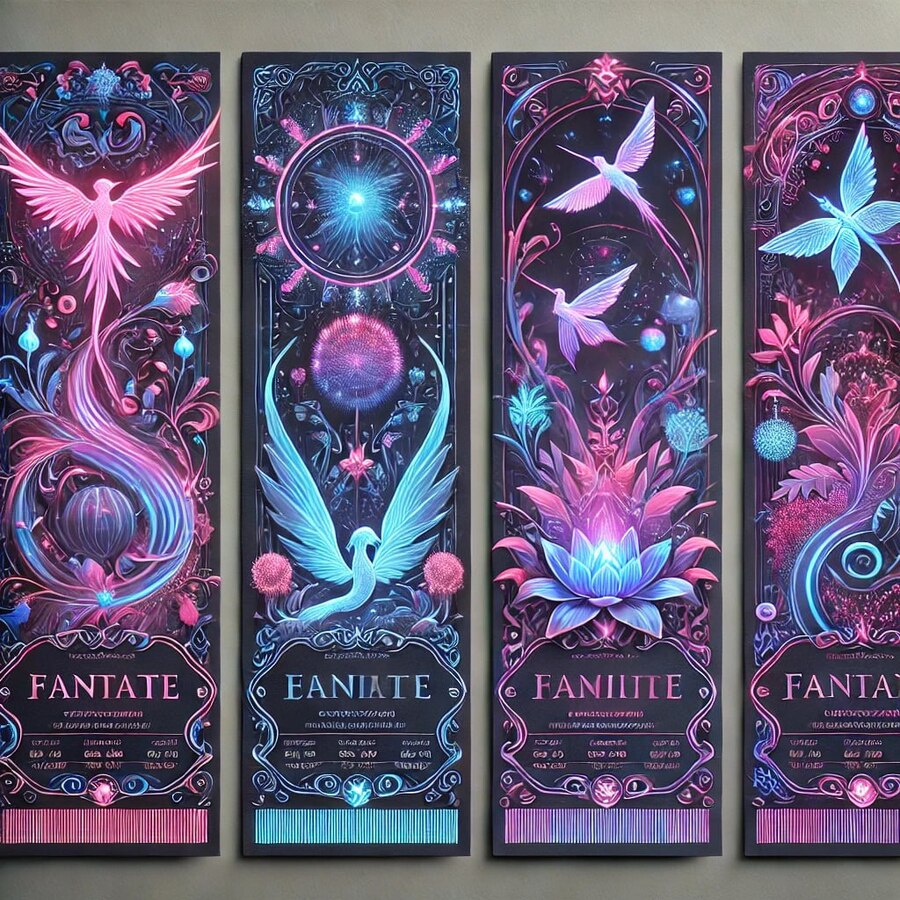 Промт3: A set of fantasy-themed tickets designed with elements inspired by neon aesthetics and magical environments. Each ticket features glowing designs
