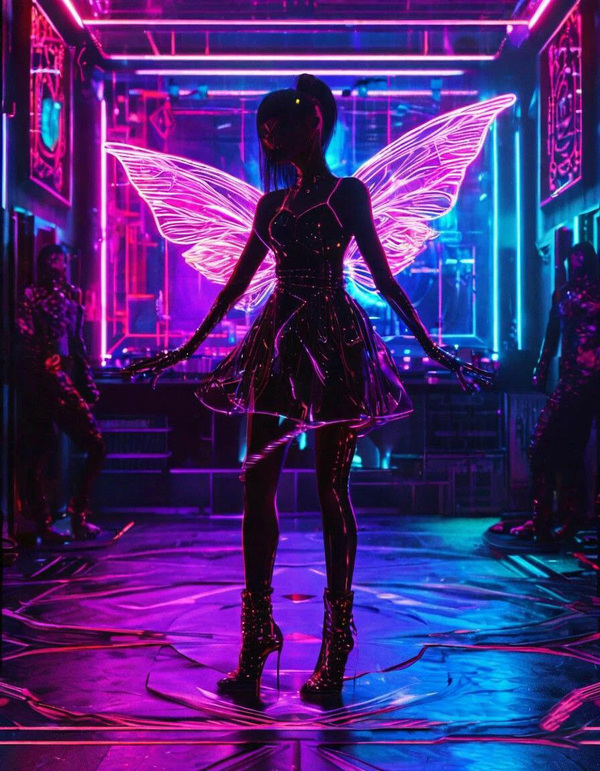 Промт1: A vertical poster (2_3 ratio) for a live performance by a popular fairy at a futuristic nightclub inspired by glowing alien jungle aesthetics.