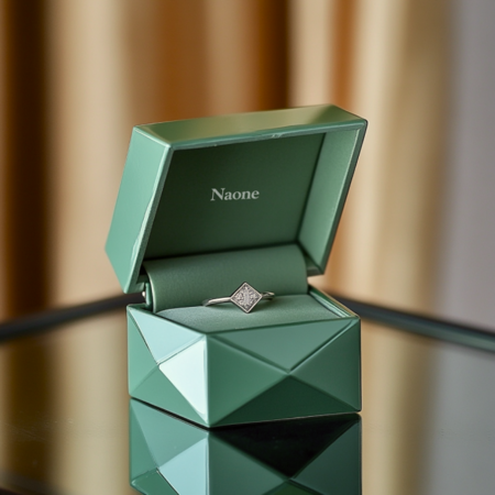 /imagine small ring box, it has a simple geometric design, green colors, stands on a glass surface on the table, inside is a minimalist silver ring