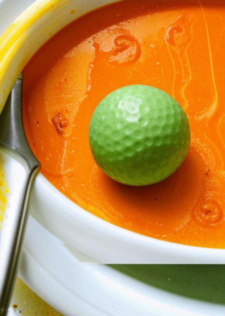 Промт: мяч для гольфа попал в суп с морковью, брызги сочно; мяч для гольфа, сильный удар клюшкой попал на чай и кофе чашки, много брызгов воды.
