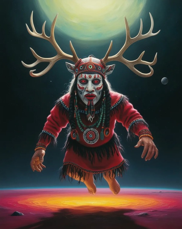 Prompt: yakutian shaman, falling through space, creepy mask, antlers, space background, illustration, concept art, hyperdetailed, 8k, ghibly, esther limones, inuit art, Kingwatsiak, ornamental, pop-art, psychedelic, macabre, creepy, unsettling, atmospheric, matte, cinematic composition, vibrant colors, volumetric light