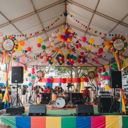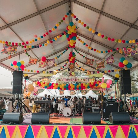 prompt: A photo of a Holi festival stage with colorful decorations. The stage is decorated with balloons, banners, and streamers. There are also musical instruments and a drum set. The background is a crowd of people. The stage is under a tent. The overall scene is vibrant and festive.