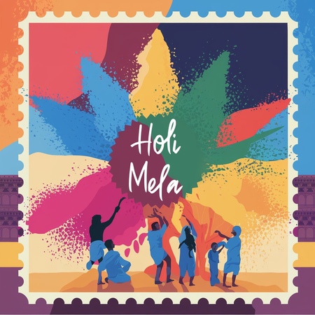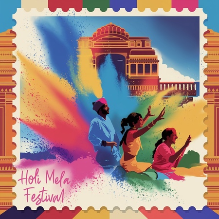prompt: A flat design illustration of a poster promoting the Holi festival. The poster is inspired by Indian postage stamps and features a vibrant image of people celebrating Holi with powder explosions in shades of blue, yellow, red, and green. The background contains traditional Indian architecture. The text is in the Indian script, with the words «Holi Festival».