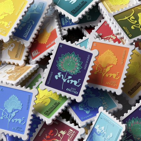 prompt: A 3D render of pins which are a merch item for the Holi festival. The design of these pins is inspired by Indian postage stamps, and its shape replicates it. The colour palette is various shades of blue, yellow, red, and green. The text font is inspired by Indian lettering.