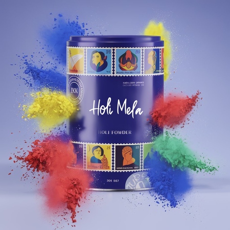 prompt: A 3D render of a tin can with coloured powder used for the Holi festival. The design of the package is inspired by Indian postage stamps, and the shape of the package replicates it. The powder is in various shades of blue, yellow, red, and green. The font is inspired by Indian lettering.
