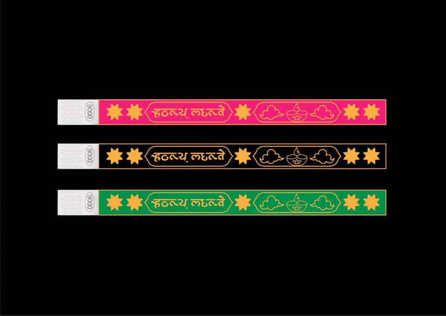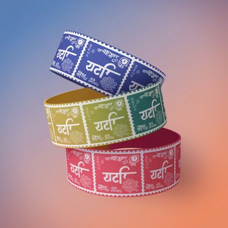 prompt: A 3D render of a festival wrist bracelet used for the Holi festival lying flat on the surface. The design of this bracelet is inspired by Indian postage stamps, and its shape replicates it. The colour palette is various shades of blue, yellow, red, and green. The text font is inspired by Indian lettering.
