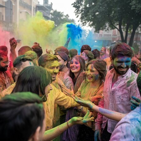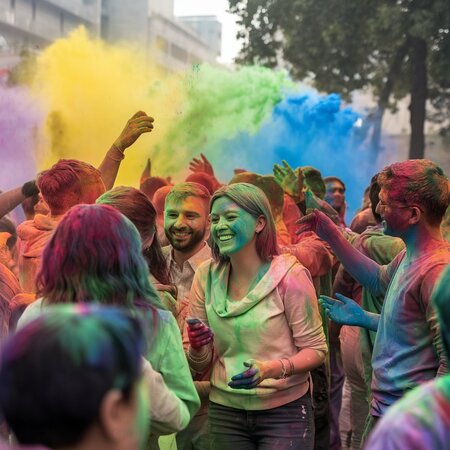 prompt: A photo of a Holi festival. There are a lot of people, and everything is very colourful. People are throwing coloured powder at each other and are smiling and laughing. There are also some people with coloured water. The background contains buildings and trees.