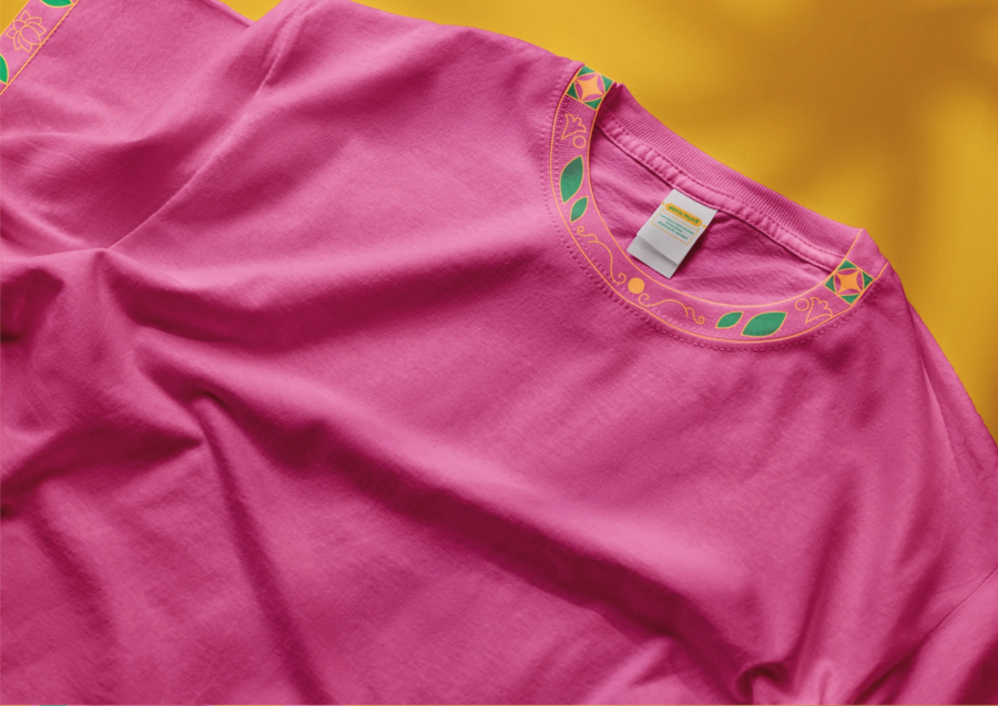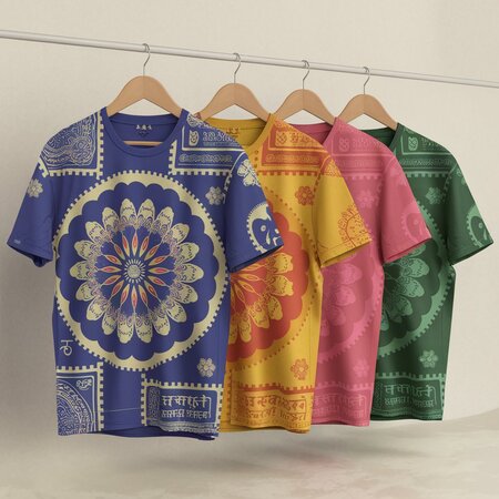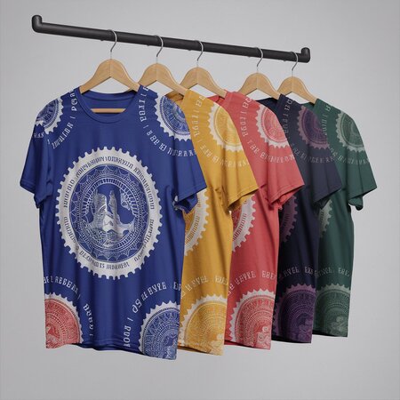 prompt: A 3D render of a hanger with t-shirts as a merch item for the Holi festival. The design of the t-shirts is inspired by Indian postage stamps, with a circular shape and intricate patterns. The colour palette includes various shades of blue, yellow, red, and green. The background is a plain white surface.