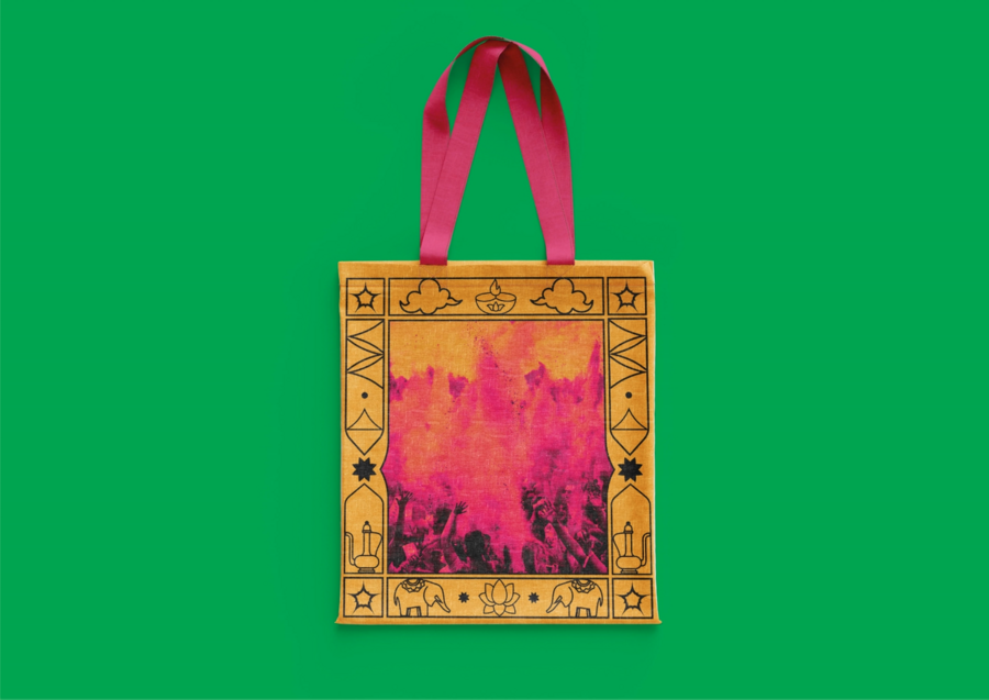 prompt: A 3D render of a shopper bag used as a merch item for the Holi festival. The design of the bag is inspired by Indian postage stamps. Colour palette is various shades of blue, yellow, red, and green, mail colour is purple. The font is inspired by Indian lettering