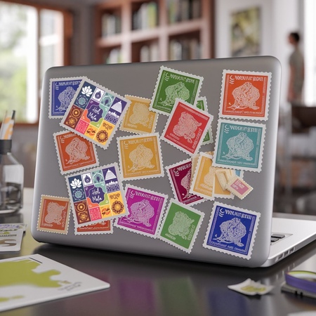 prompt: A 3D mockup of stickers on a laptop. There are plain square stickers and stickers in the shape of Indian postage stamps of various colours. The laptop is open on a desk, with a few other objects around it. The background is blurred, showing a room with bookshelves and a window.